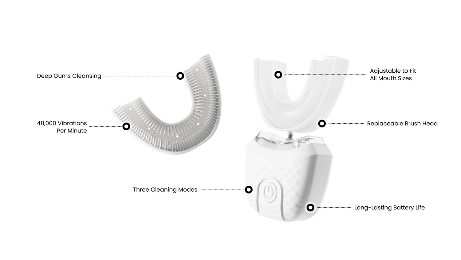 Better Smile’s 360° Ultrasonic U-Brush uses 48,000 sonic vibrations per minute to clean every surface of your teeth — hands-free and perfectly timed for healthier gums